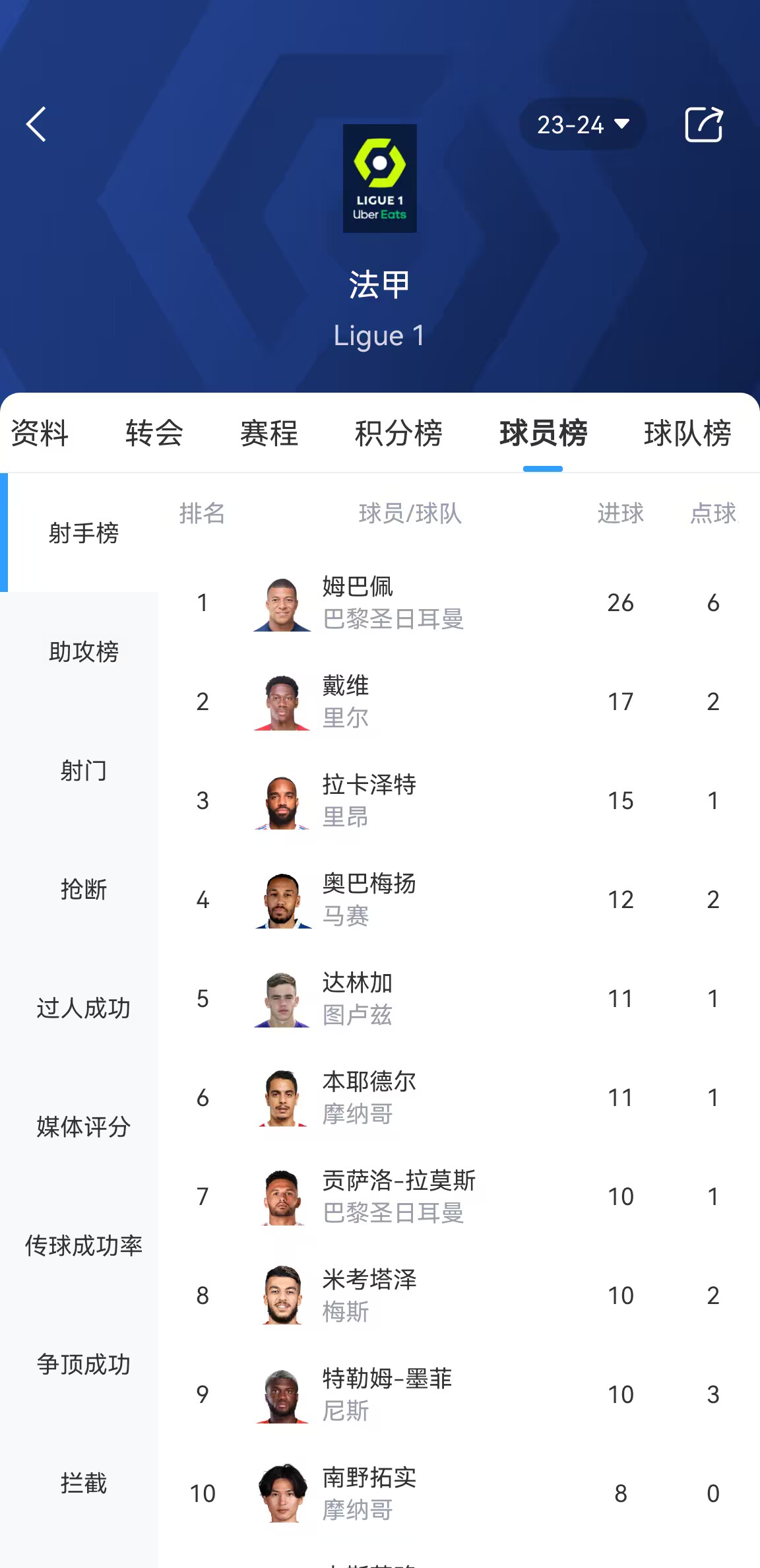 6连法甲金靴?姆总26球领跑联赛射手榜,领先第二9球